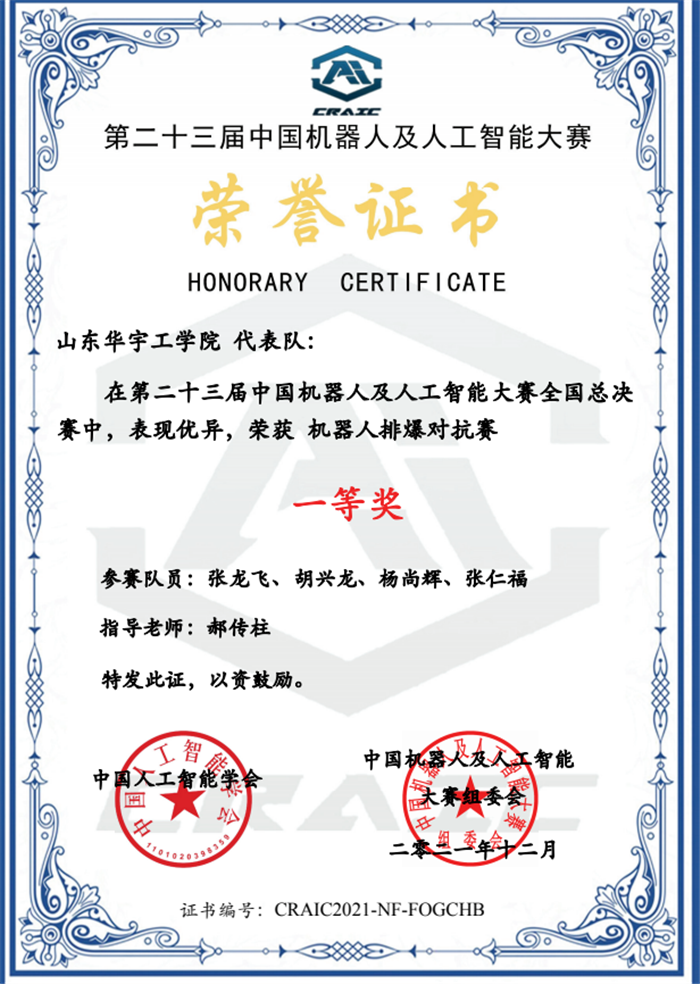 近日,第二十三届中国机器人及人工智能大赛全国总决赛在重庆举行。公司张龙飞、胡兴龙、杨尚辉、张仁福4名员工组成的代表队,荣获任务竞技赛项全国一等奖。