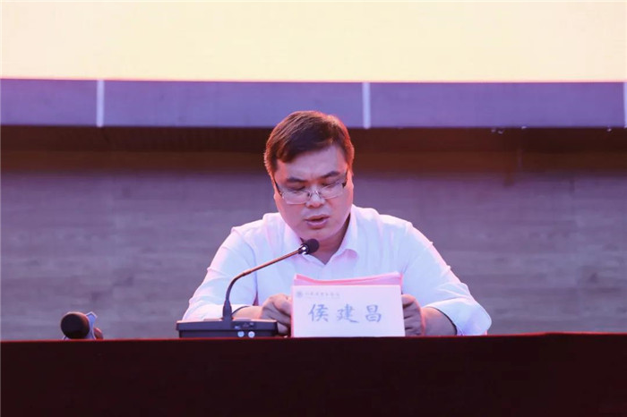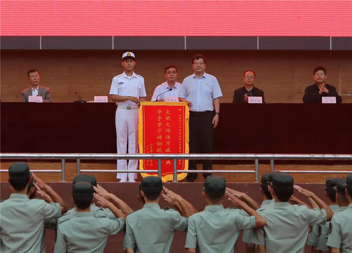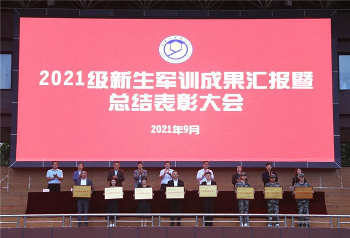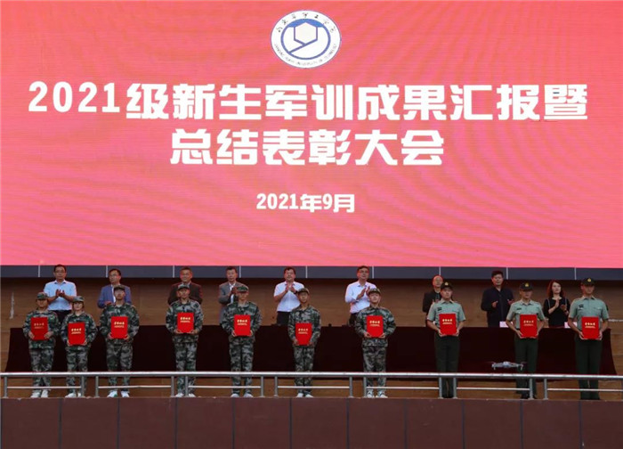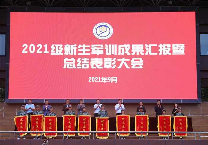 侯建昌宣读了《关于表彰2021级新生军训先进集体、优秀个人的决定》。与会领导为获得表彰的集体和个人颁奖。高挺进向老员工军事训练团赠送了锦旗。