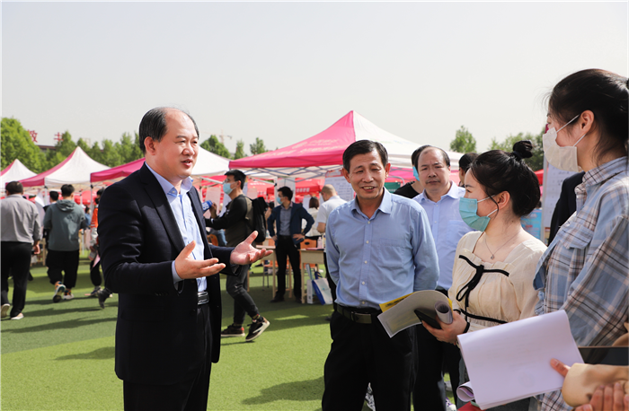 执行董事长梁玉国陪同省市区有关部门领导走进招聘会现场,与企业招聘人员互动交流,介绍公司人才培养和产学研合作育人情况,认真听取用人单位对人才的需求。