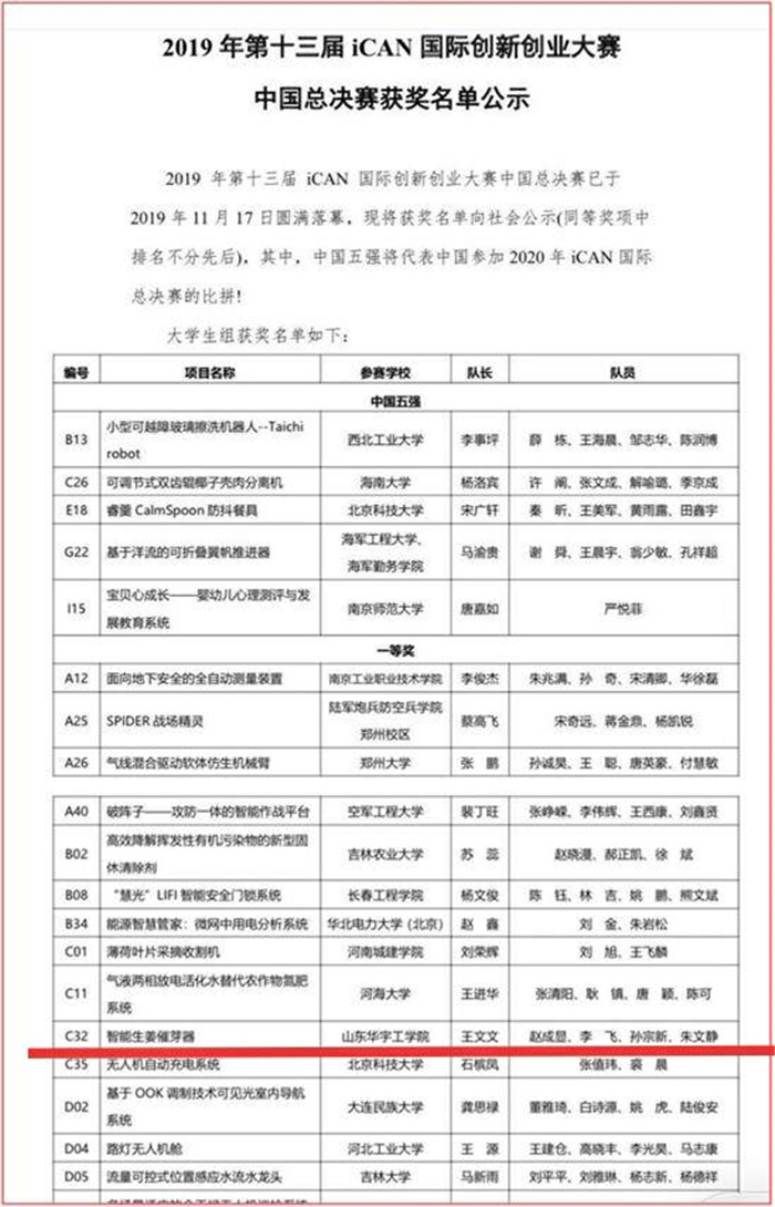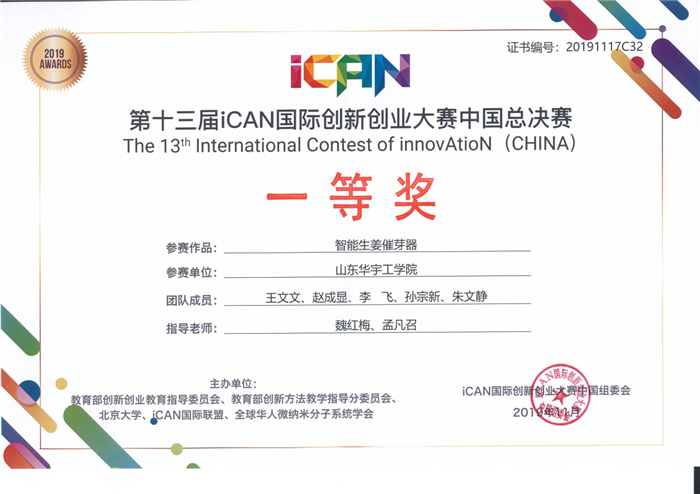 11月16日至17日,第十三届iCAN国际创新创业大赛中国总决赛在南京举行,公司参赛作品“智能生姜催芽器”以山东省赛区选拔赛一等奖的成绩成功入围,经过激烈角逐,最终荣获中国总决赛一等奖。