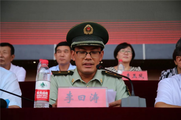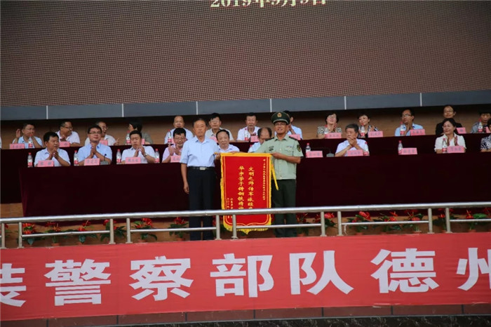 集团副董事长杜光荣向承训部队武警德州支队赠送了锦旗。武警德州支队副参谋长李曰涛讲话,他高度评价了军训取得的成绩和公司员工勇于拼搏、积极向上的精神。