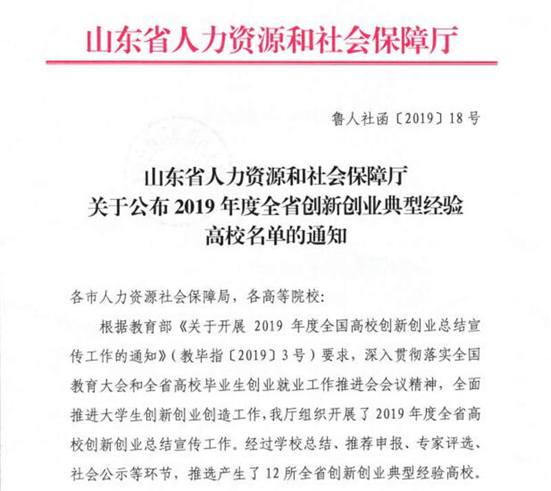 近日,山东省人力资源和社会保障厅下发了《关于公布2019年度全省创新创业典型经验高校名单的通知》(鲁人社函〔2019〕18号),公司与山东师范大学等12所高校被评为“山东省创新创业典型经验高校”。