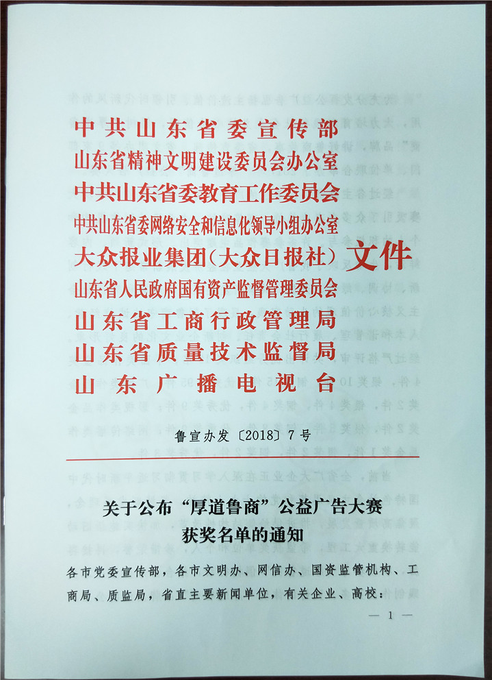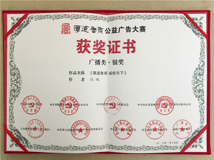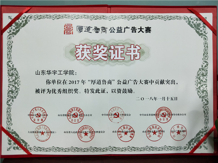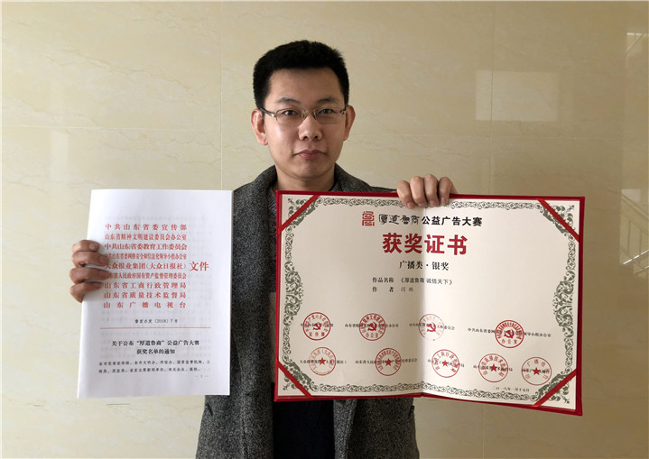 2月20日,山东省“厚道鲁商”公益广告大赛落下帷幕,公司设计与艺术公司教师闫鹏制作的作品《厚道鲁商,诚信天下》获得广播类银奖、《秉承厚道鲁商精神 铸就现代商业传奇》获得广播类优秀奖,公司荣获优秀组织奖。
