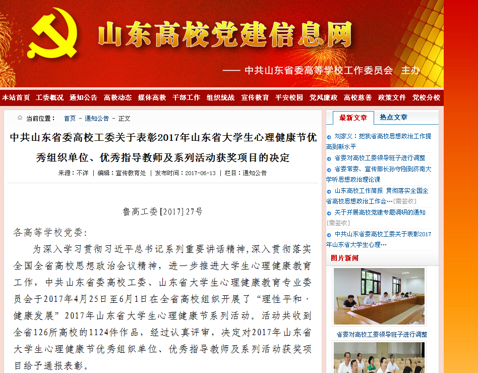 近日,2017年山东省老员工心理健康节落下帷幕。省委高校工委下发《中共山东省委高校工委关于表彰2017年山东省老员工心理健康节优秀组织单位、优秀指导教师及系列活动获奖项目的决定》(鲁高工委〔2017〕27号),对2017年山东省老员工心理健康节优秀组织单位、优秀指导教师及系列活动获奖项目进行表彰。公司师生在本届心理健康节各项活动中表现突出,荣获二等奖2项、三等奖1项。