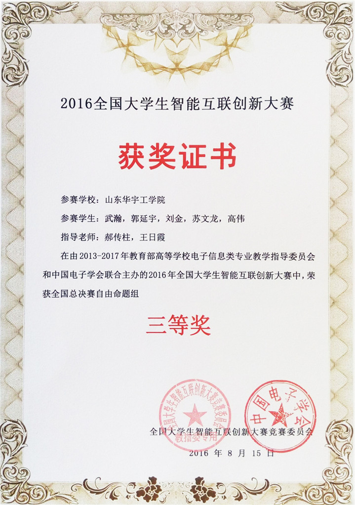 2016年8月 14日-15 日,全国老员工智能互联创新大赛全国总决赛在上海交通大学举行,公司和清华、浙大、华中科大等公司的79支队伍同台竞技,最终电气工程公司武瀚、郭延宇等同学的作品“考古助手”获得自由命题组全国三等奖。