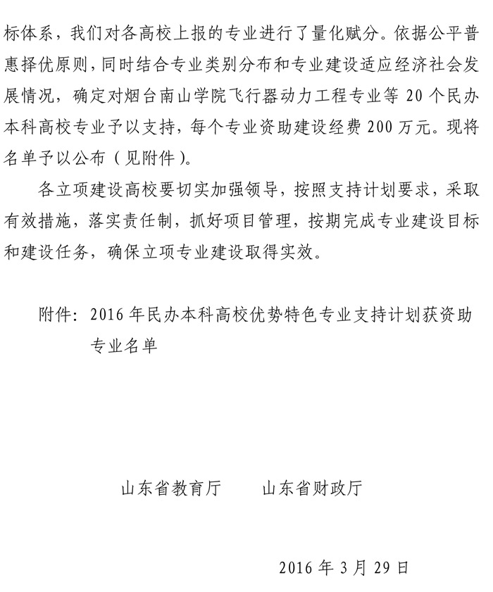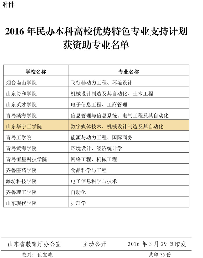 3月29日,山东省教育厅和山东省财政厅联合下发《关于公布2016年民办本科高校优势特色专业支持计划获资助专业名单的通知》(鲁教高字〔2016〕2号)文件,公司数字媒体技术、机械设计制造及其自动化2个专业名列其中,获得400万元的专项建设资金支持。
