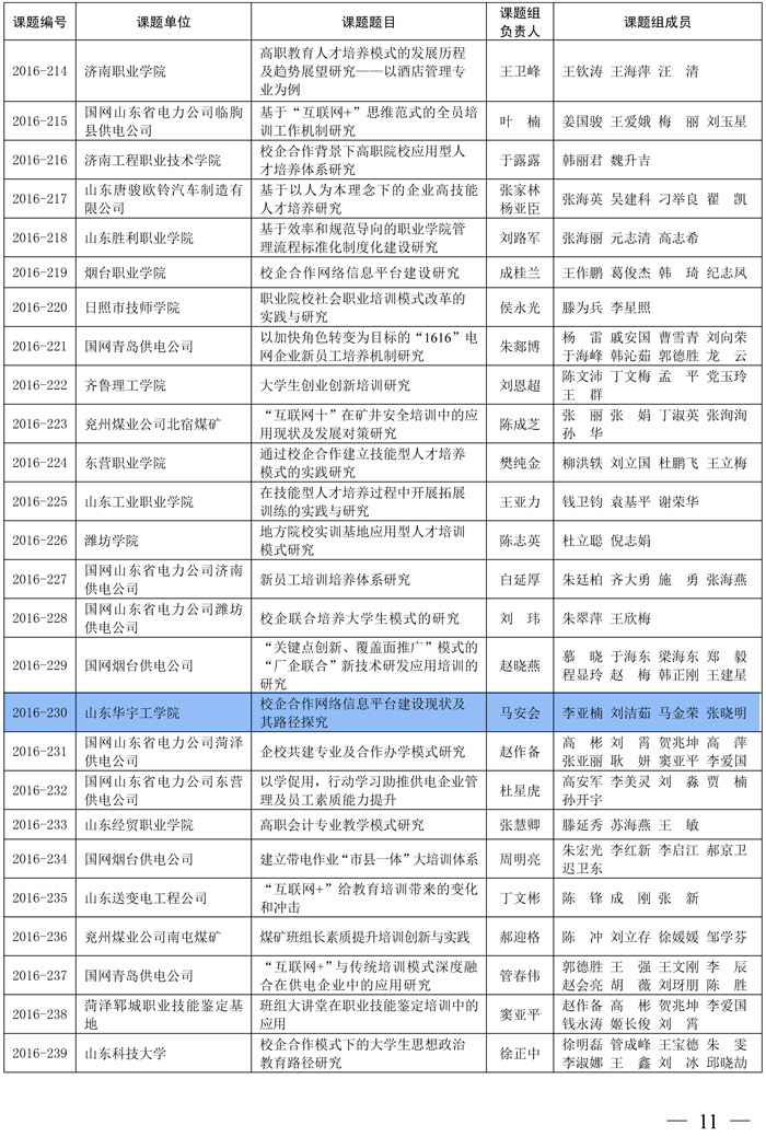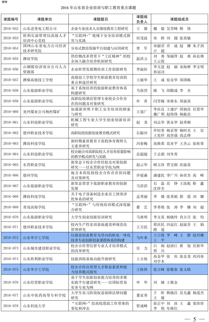 根据《关于公布2016年山东省企业培训与职工教育重点课题立项的通知》(鲁职教协字〔2016〕3号),公司获得立项的3项课题为:王桂伟老师主持的《校企合作应用型人才职业素质和能力培养模式研究》(项目编号2016-075)、马安会老师主持的《校企合作网络信息平台建设现状及其路径研究》(项目编号2016-230)和马叶革老师主持的《以就业创业教育为导向的机电一体化技术专业创新创业课程体系的构建》(项目编号2016-072)。