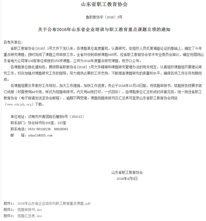 4月5日,接山东省职工教育协会通知,2016年山东省企业培训与职工教育重点课题的申报、评审、立项工作已经完成,公司申报的3项企业培训与职工教育课题获得立项。本年度全省共申报课题545项,其中108家单位的255项被确定为重点研究课题。