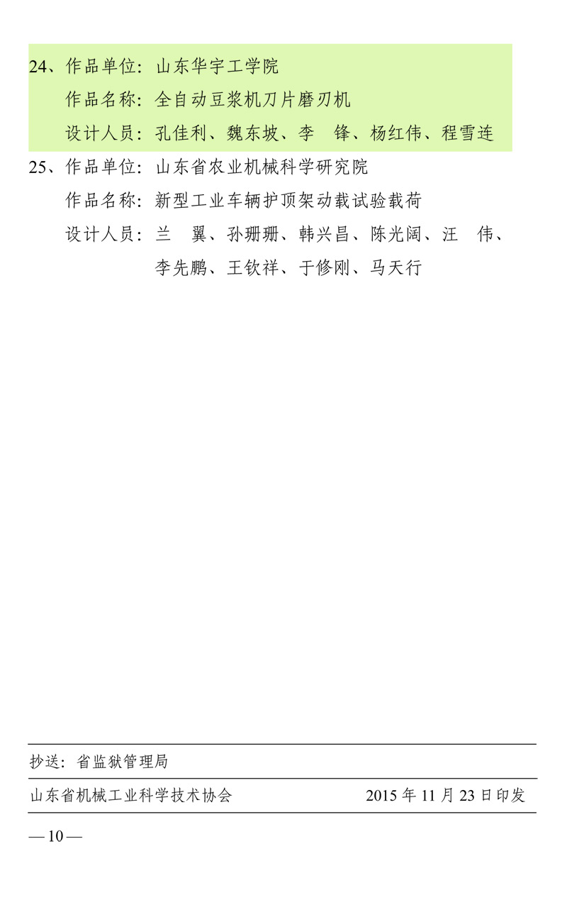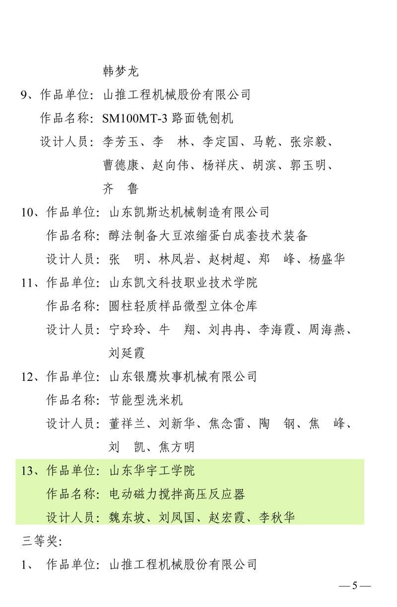 12月7日,山东机械网公布了《关于表彰2015第一届山东省机械工业技术与工艺创新大赛获奖单位和人员的决定》。公司参赛的两项作品全部获奖,其中公司魏东坡老师主持的《电动磁力搅拌高压反应器》项目获得全省二等奖;孔佳利老师主持的《全自动豆浆机刀片磨刃机》项目获得全省三等奖。并授予魏东坡老师“山东省国防机械电子工业系统五一劳动奖章”的称号,授予孔佳利等三位老师“山东省机械行业优秀科技工作者”的称号。