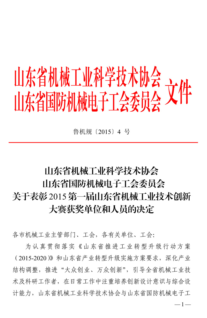 为认真贯彻落实《山东省推进工业转型升级行动计划(2015-2020)》要求,深化产业结构调整,推进“大众创业、万众创新”,引导全省机械工业技术及科研工作,山东省机械工业科学技术协会与山东省国防机械电子工会联合举办了全省机械工业技术与工艺创新大赛。公司积极申报了两项作品,据悉这次大赛共收到参评作品117项,其中技术创新78项,工艺创新39项。经专家评审,共有39项技术类作品,23项工艺类作品分别获一、二、三等奖。