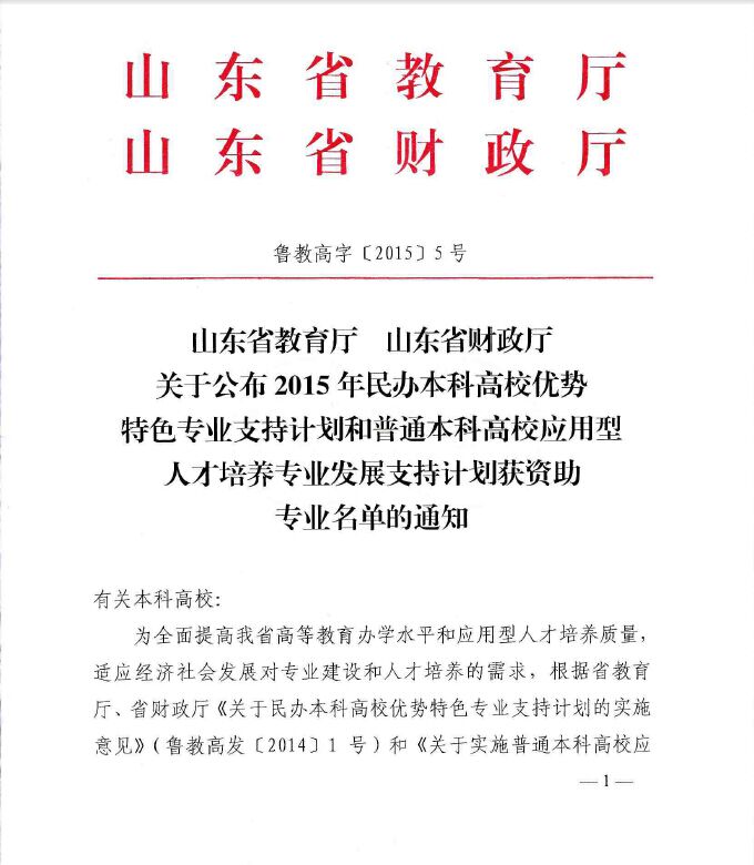 5月4日,山东省教育厅和山东省财政厅联合下发《关于公布2015年民办本科高校优势特色专业支持计划获资助专业名单的通知》(鲁教高字〔2015〕5号)文件,公司电气工程及其自动化和建筑环境与能源应用工程2个专业名列其中,获得400万元的专项建设资金支持。