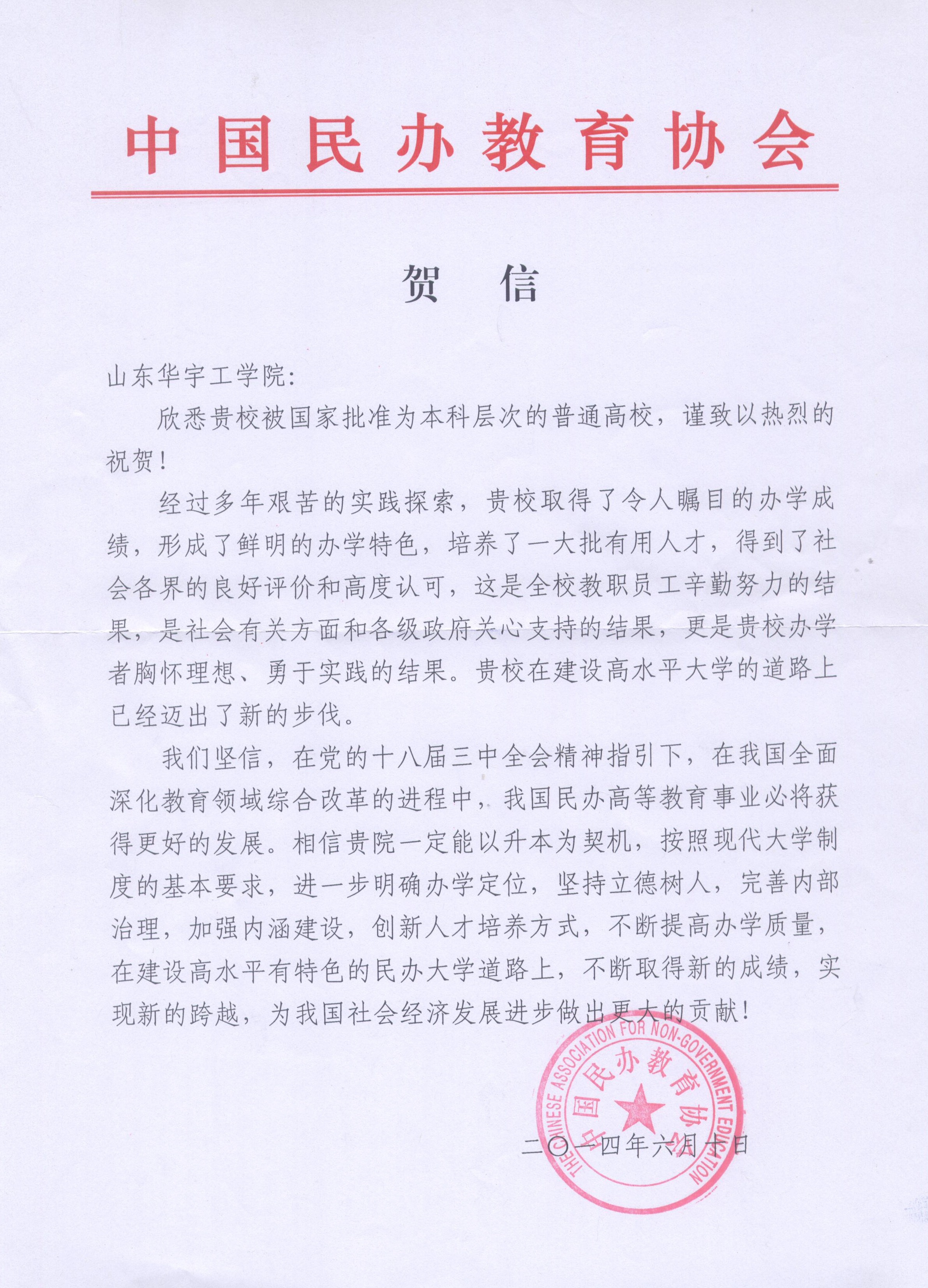 2014年6月10月,中国民办教育协会给公司发来贺信,祝贺公司升格为全日制普通本科高校。在贺信中,中国民办教育协会对公司多年来取得的办学成绩及形成的鲜明办学特色给予了高度评价,并希望公司在建设高水平有特色的民办大学道路上,不断取得新的成绩。贺信全文如下: