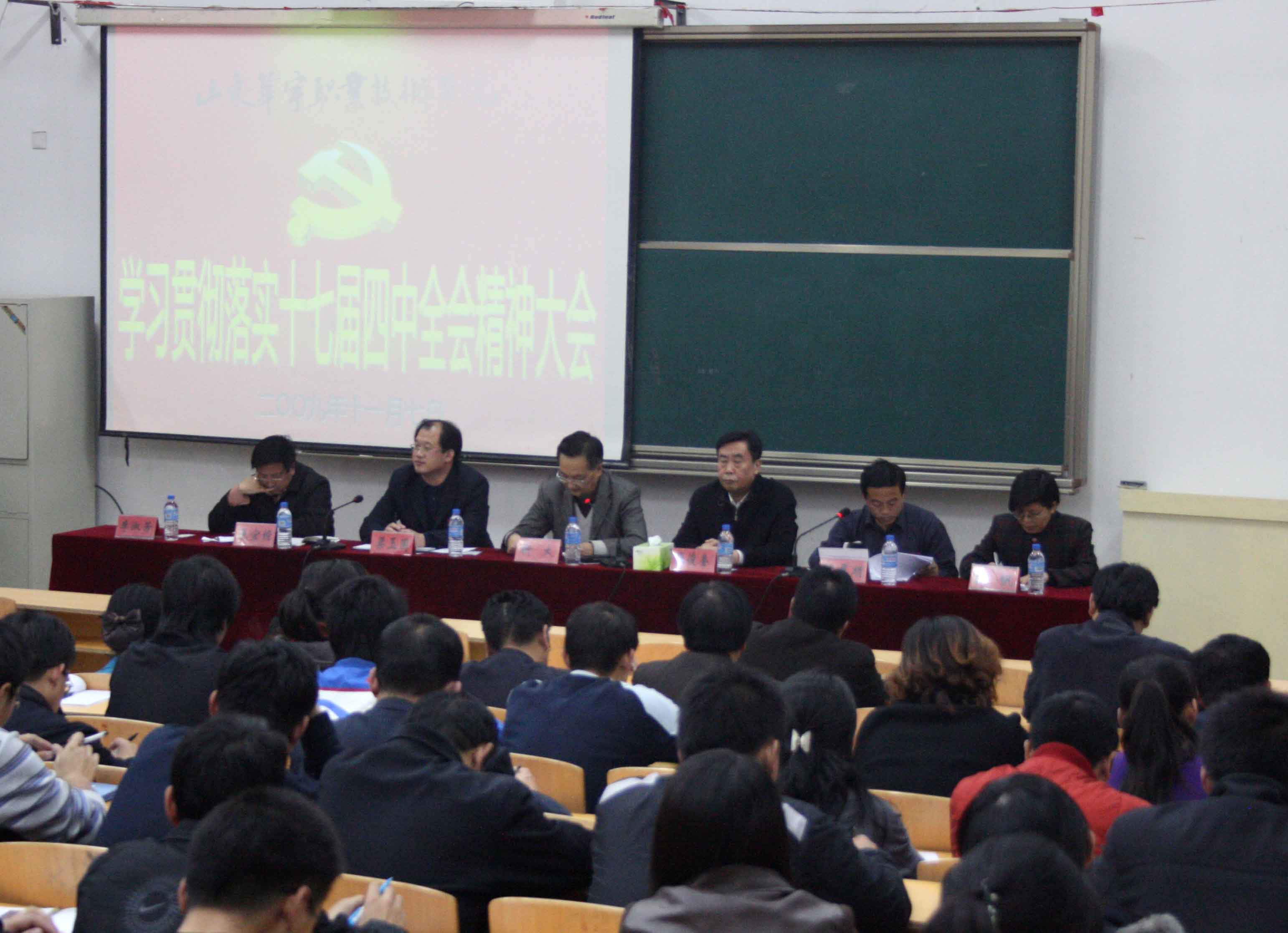 2009年11月7日,公司在7号楼103多媒体教室召开学习贯彻十七届四中全会精神大会。公司党委书记靳大及全体党委委员出席大会,山东省高校工委党建工作联络员、山东省教育厅督导员张俊奎应邀参加会议并在主席台就座。大会由党委委员、经理助理叶厚顺主持。