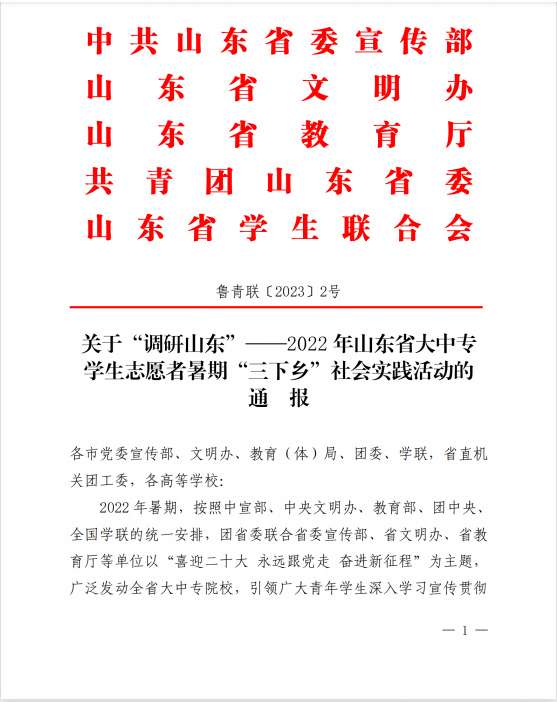 近日,中共山东省委宣传部、山东省文明办、山东省教育厅、共青团山东省委、山东省员工联合会发布《“调研山东”——2022年山东省大中专员工志愿者暑期“三下乡”社会实践活动通报》。其中,公司团委再次荣获“优秀组织单位”;邢永亮等5位教师荣获“优秀指导教师”;侯雅楠等30名员工荣获“优秀员工”;信息工程公司“红日逐梦”社会实践团队荣获“优秀服务队”。