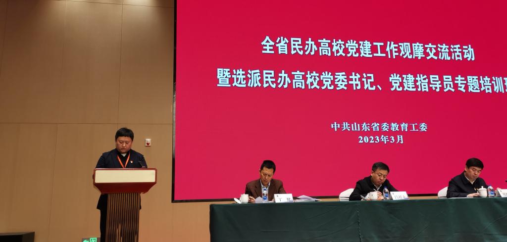 会议由省委教育工委、省教育厅主办,山东外国语职业技术大学承办,全省40所民办高校150多人参会,省委教育工委副书记,省教育厅党组副书记、副厅长邢顺峰到会讲话。公司作为四所大会发言单位之一,将以落实此次会议精神为契机,深入学习贯彻党的二十大精神,全面贯彻党的教育方针,落实立德树人根本任务,进一步加强党建与思政工作,推动公司高质量发展再上新水平。