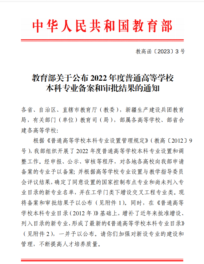近日,《教育部关于公布2022年度普通高等公司本科专业备案和审批结果的通知》(教高函〔2023〕3号)已发布。公司申报的新能源汽车工程、电气工程与智能控制、数据科学与大数据技术、智能建造、数字经济、公共艺术等6个本科专业获批备案。至此,公司本科专业总数达到36个,涵盖了工学、经济学、管理学、文学、艺术学五大学科门类。