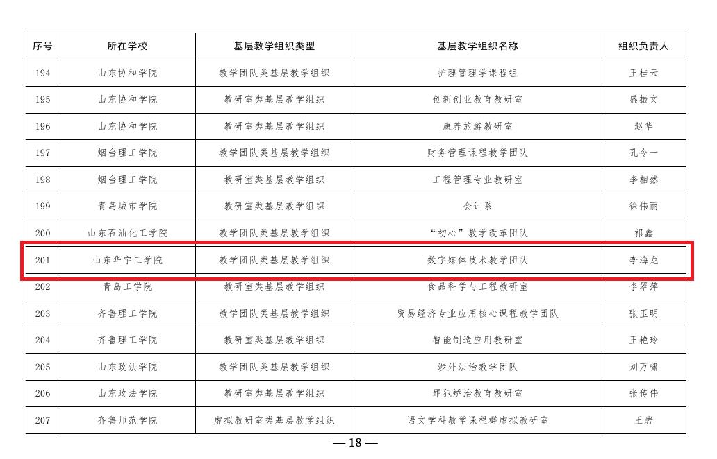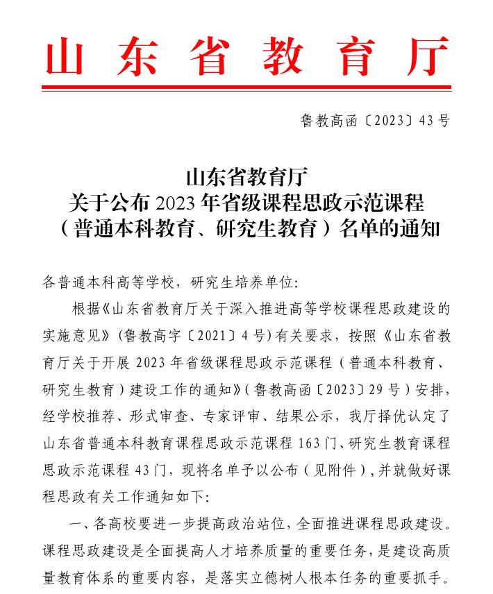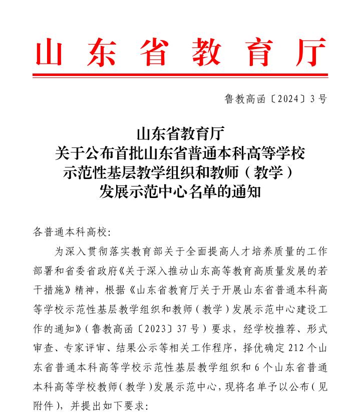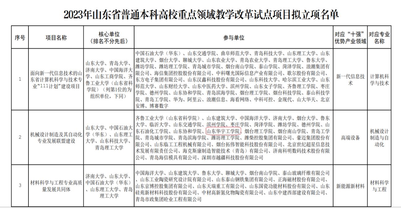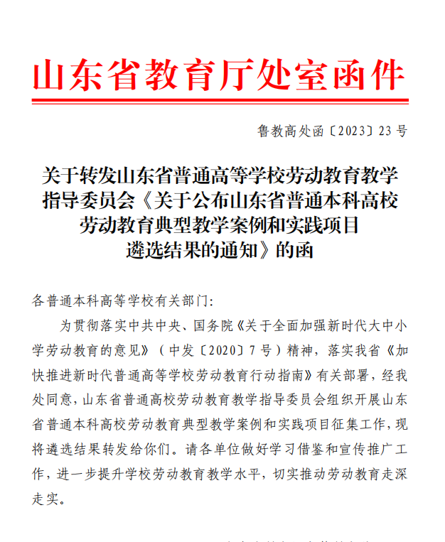 根据《2023年山东省普通本科高校重点领域教学改革试点项目拟立项名单》《山东省教育厅关于公布2023年省级课程思政示范课程(普通本科教育研究生教育)名单的通知》等,公司获批山东省本科高校重点领域教学改革试点项目1项,山东省普通本科教育课程思政示范课程1门,山东省普通高等公司实验教学示范中心1个,山东省普通高等公司示范性实习(实训)基地3个,山东省示范性基层教学组织1个;获评山东省普通本科高校劳动教育典型教学案例4项,山东省普通本科高校劳动教育典型实践项目3项,山东省高等公司课程联盟优秀案例二等奖1项。