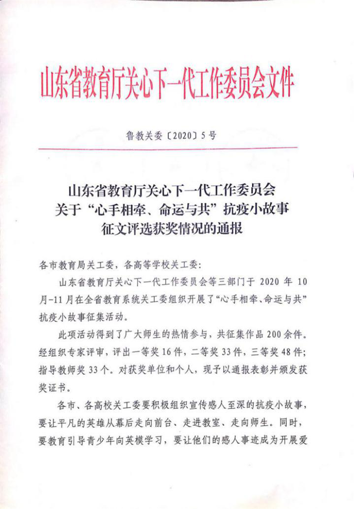 2020年10月-11月,山东省教育厅关心下一代工作委员会、山东省教育厅思想政治工作处、山东省教育社三部门在全省教育系统关工委组织开展了“心手相牵、命运与共”抗疫小故事征集活动,公司荣获二等奖1项,三等奖3项,并荣获“组织奖”荣誉称号。