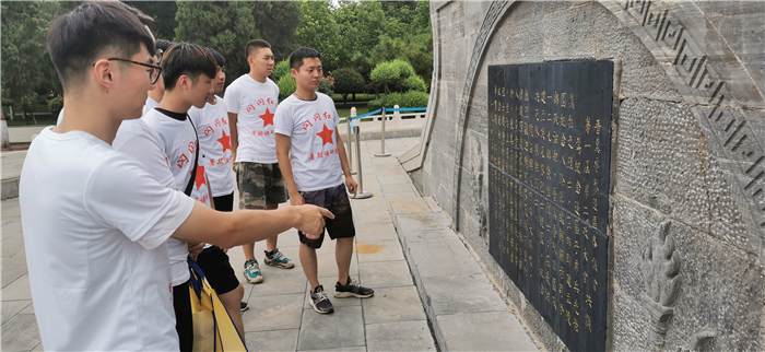 8月5日,团队队员来到了邯郸市的晋冀鲁豫烈士陵园。入门处,巍然耸立着高24米的烈士纪念塔,塔顶光芒四射的红五星,象征着中国革命的伟大胜利。塔的正面镌刻着毛泽东的题词:“英勇牺牲的烈士们千古无上光荣”,东、北、西三面分别为周恩来、刘少奇、朱德的题词。