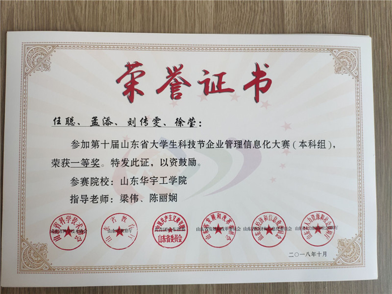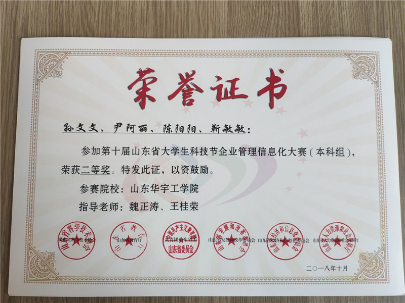 近日,由山东省教育厅、山东省科学技术协会、山东省发展和改革委员会、山东省经济和信息化委员会等六部门共同举办的第十届山东省老员工科技节企业管理信息化大赛(本科组)落下帷幕。公司经济管理公司员工刘传雯、徐莹、任聪、孟添(指导教师梁伟、陈丽娴)荣获本科组团体一等奖;尹阿丽、靳敏敏、陈阳阳、孙文文(指导教师魏正涛、王桂荣)荣获本科组团体二等奖。