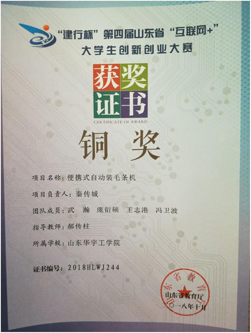 近日,山东省教育厅、山东省财政厅公布了“建行杯”第四届山东省“互联网+”老员工创新创业大赛获奖结果,公司便携式自动装毛条机项目获铜奖,这是公司参加山东省“互联网+”老员工创新创业大赛并斩获大奖,实现了公司在该项赛事中的突破。