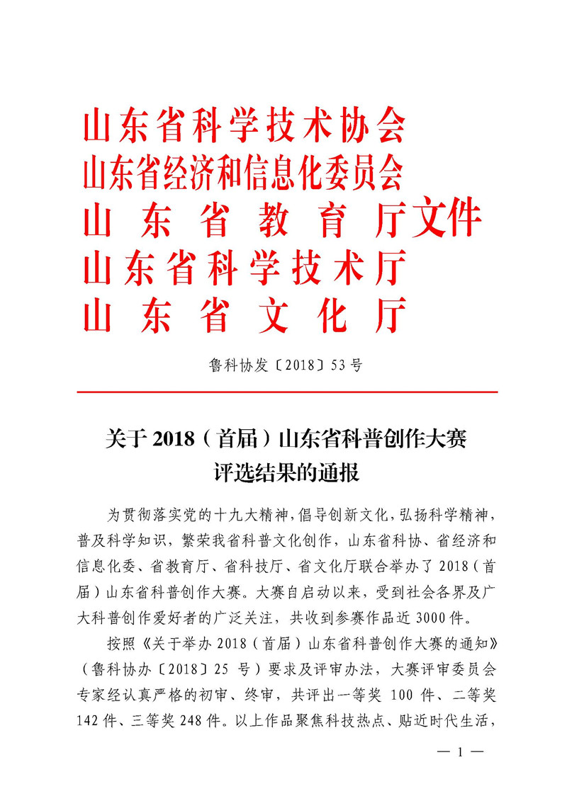 近日,山东省科学技术协会下发了《关于2018(首届)山东省科普创作大赛评选结果的通报》(鲁科协发〔2018〕53号),公司共有8项作品获奖。其中,科普文学类,二等奖1项,三等奖4项;科普视频类,二等奖1项,三等奖1项;科普摄影类,三等奖1项。