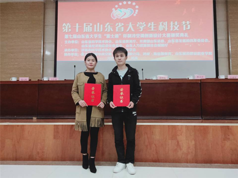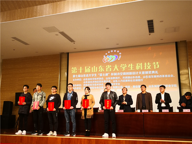 第十届山东省老员工科技节暨第七届山东省老员工“富士通将军”杯制冷空调创新设计大赛颁奖典礼于山东城市建设职业公司图书馆报告厅隆重举行。能源与环境工程公司员工的参赛作品在大赛中获得二等奖1项,三等奖2项,优秀奖若干项的优异成绩。魏丰君、王燕、相培等老师获得优秀指导教师奖。同时,公司因参与大赛积极性高,作品质量整体较好,被大赛组委会授予优秀组织奖。公司的2018届毕业生王宗伟、单宝琦两位同学考入了山东建筑大学研究生,这次代表建筑大学参赛并获奖,与公司2015级建环专业参赛员工王梦瑶、宋玉坤同台领奖,成为颁奖典礼现场的一个亮点。