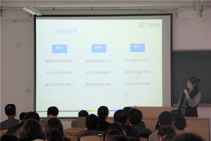 会上,教育部在线教育研究中心交流联络部课程顾问、学堂在线高级项目经理徐静超老师从我国在线开放课程的发展历程、以MOOC为代表的在线开放课程的认识、持续推进在线开放课程的建设与应用等几个方面对在线开放课程特点及建设内容进行了详细的介绍。随后,学堂在线课程部教学支持项思思老师对学堂云、学堂云的功能、教师如何教、员工如何学等方面进行了详细的讲解,对学堂在线开放课程平台进行了现场操作,就如何建课、如何管理课程进行了演示,并分享了课程建设的经验。