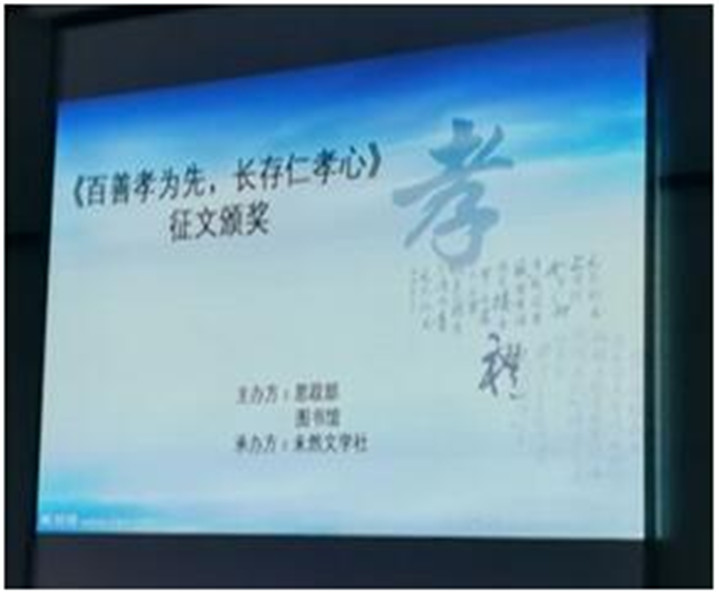 本次活动共征集稿件500余份,内容丰富,文体多样。文章内容主要以身边“孝”文化的表现实例和“孝”文化中鲜为人知的民间生动轶闻及传说为主;同学们用诗歌、散文、随笔、通讯特写等不同方式,反映孝老爱亲情怀,颂扬先进典型事迹。本次征文共评出一等奖2人,二等奖4人,三等奖7人。设计与艺术公司陈晓芸、张莹2名同学获得一等奖。
