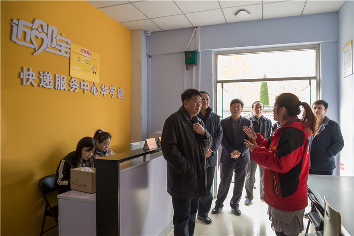 11月16日,国家邮政局党组成员、副局长刘君一行来公司进行调研,山东省邮政管理局党组书记、局长赵民、德州市邮政管理局党组书记、局长张统柱陪同调研。公司副董事长杜光荣、后勤处副处长李光武陪同考察了公司“近邻宝”校园快递服务中心。