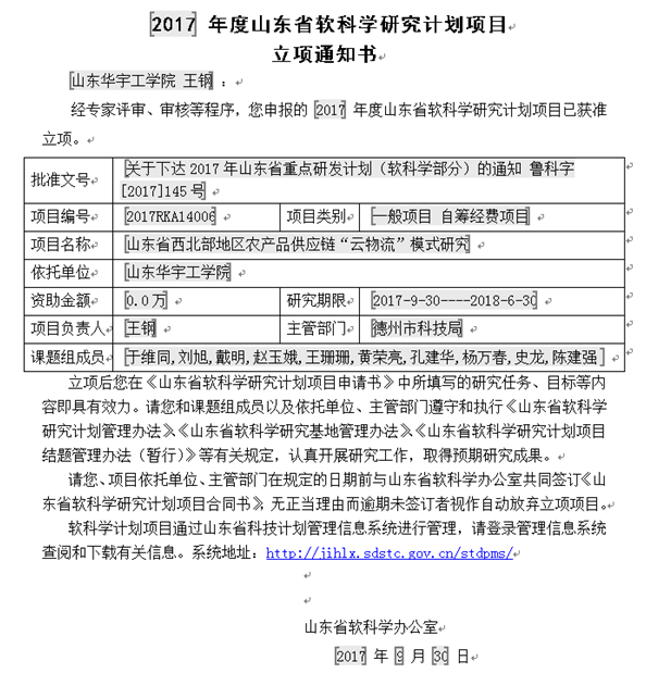 近日,山东省科学技术厅下发了《关于下达2017年山东省重点研发计划(软科学)部分的通知》(鲁教字[2017]145号),公司王钢老师的《山东省西北地区农产品供应链“云物流”模式研究》(项目编号2017RKA14006)获批立项,这也是公司2017年度获批的唯一一项软科学项目,同时也填补了公司山东省重点研发计划的空白。
