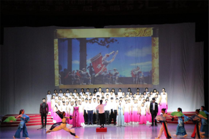 演出在机械工程公司代表队演唱的《团结就是力量》和《歌唱祖国》中拉开序幕。团结锻造精神,团结凝聚力量,他们用激情唱出了华宇学子的光荣与梦想;随后各公司代表队分别演唱了《弹起我心爱的土琵琶》《没有共产党就没有新中国》《地道战》《万泉河水清又清》《我的中国心》《在希望的田野上》《国家》等曲目。一首首大气磅礴、雄浑激荡的歌曲唱响全场,奏响了中华民族救亡图存的时代最强音。