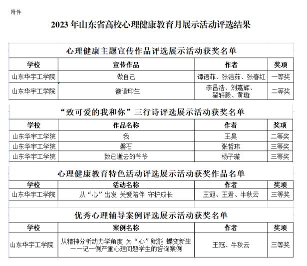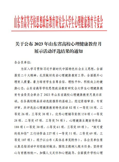 9月11日,山东省高等公司思想政治教育研究会老员工心理健康教育专委会发布了《关于公布2023年山东省高校心理健康教育月展示活动评选结果的通知。公司共获奖7项,其中一等奖1项,二等奖2项,三等奖4项。