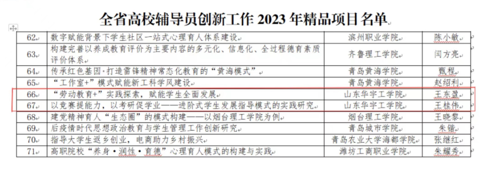 近日,山东省教育厅(省委教育工委)公布了全省高校辅导员创新工作2023年精品项目评选结果。公司《“劳动教育+”实践探索,赋能员工全面发展》《以竞赛提能力,以考研促学业——进阶式员工发展指导模式的实践研究》成功获评,实现了在该领域的新突破。