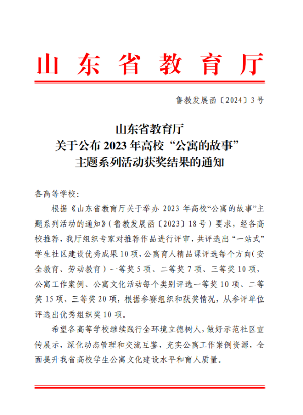 近日,山东省教育厅公布了2023年高校“公寓的故事”主题系列活动评选结果,公司荣获二等奖4项、三等奖2项。