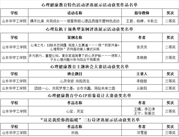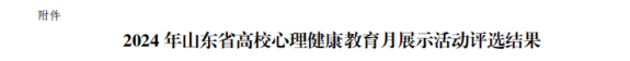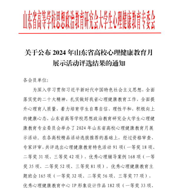 近日,山东省高等公司思想政治教育研究会老员工心理健康教育专委会发布了《关于公布2024年山东省高校心理健康教育月展示活动评选结果的通知》,公司7件作品获奖,其中二等奖2项、三等奖5项。