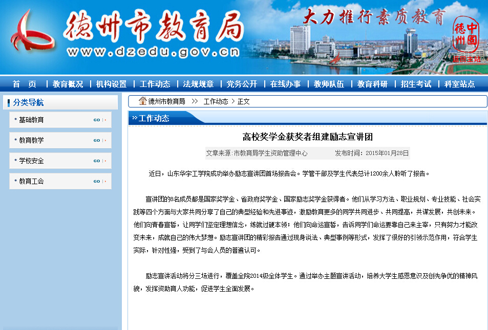 2015年01月28日,德州市教育局网站以《高校奖学金获奖者组建励志宣讲团》为题报道公司励志宣讲团活动情况。